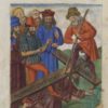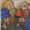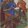 Christ chargé de la Croix. Juifs et musulmans (chapeau bleu et un autre personnage derrière) se moquent de lui.