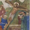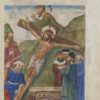 Christ cloué sur la Croix. Juifs et musulmans s’en félicitent. Celui avec le marteau en bas est musulman, ainsi qu’un autre avec un foulard blanc et robe bleu. L’autre musulman a un chapeau bleu et rouge. Celui avec chapeau rouge et noir ainsi que l’autre qui martèle en haut de la Croix sont des juifs.