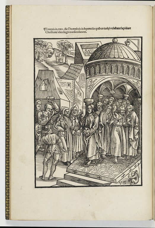 Jésus et les prêtres Juifs. A la sortie du Temple, un juif essaye de lui jeter une pierre.