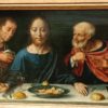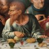 Judas rouge pendant la dernière Cène, anticipant la trahison à Jésus avec son regard. Il a dans sa main le petit sac de monnaie reçu pour sa trahison.