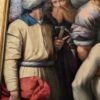 Lamentation de la mort de Christ. Un musulman avec une coiffe bleue et un marteau dans la main confabule avec un juif avec une barbe bifide rouge.