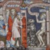 Saint Denis est emprisonné. Le préfet romain Fescennius est enrobé avec un foulard musulman ; Saint Denis est incarcéré probablement par un musulman (chapeau bleue). Un philistin et un musulman regardent.