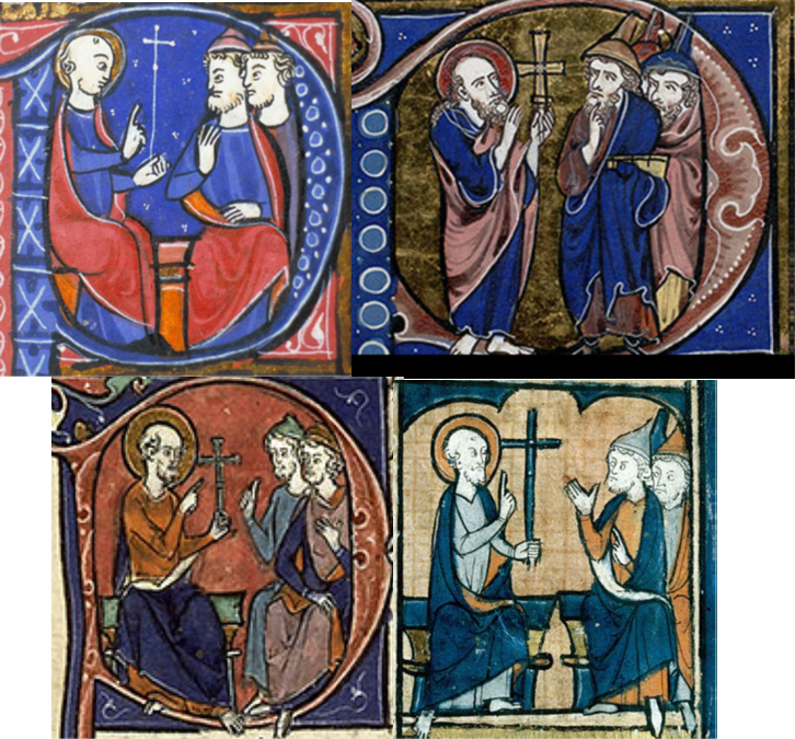 Bibles illustrées du 13ème siècle, France. Paul présente la croix aux juifs. Les ressemblances sont importantes et les juifs sont toujours représentées avec un chapeau.